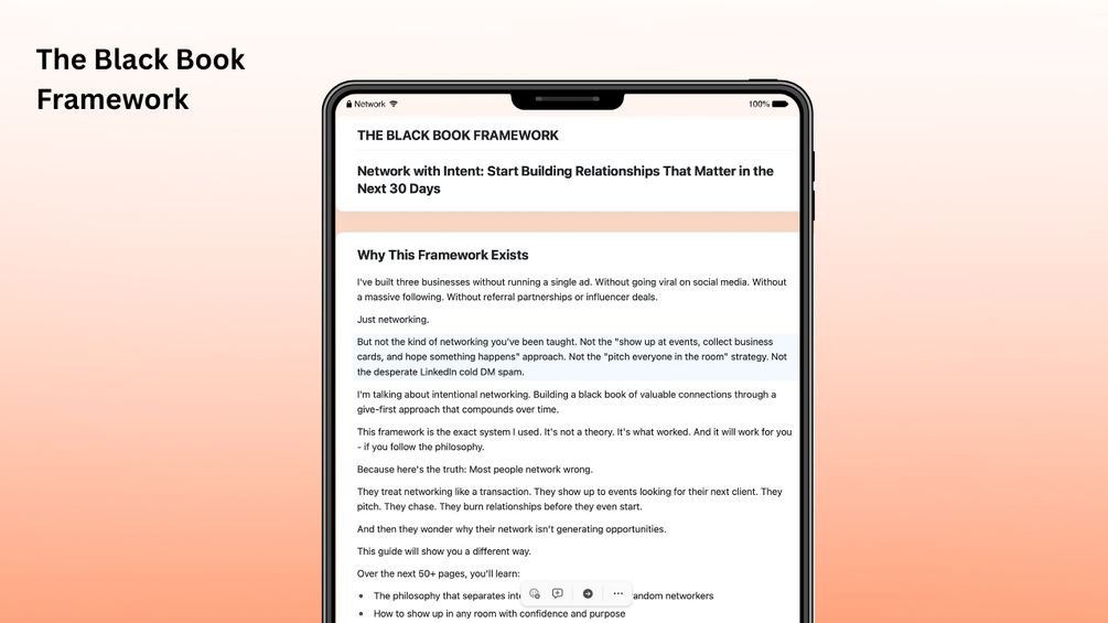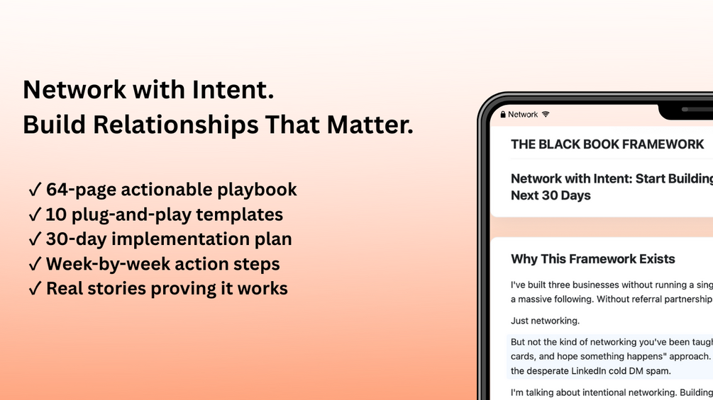 Stop networking randomly. Start building intentionally.Get the exact 30-day system I used to build 3 businesses without ads, viral content, or a massive following. Just strategic relationships that compound.Inside: 64 pages | 10 plug-and-play tools | 30-day action planLearn how to navigate any room, make people remember your name, and build a black book of valuable connections that create opportunities for years.No pitching. No selling. Just intentional relationship-building that works.
